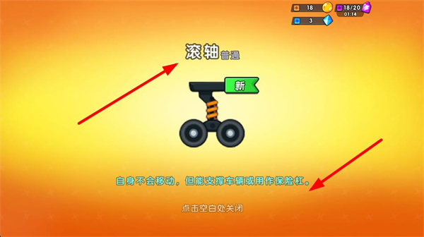 3、解鎖滾軸部件,了解其自身不移動但能支撐車輛或作保險杠的功能,點擊空白處關閉提示,繼續進行賽車相關操作。