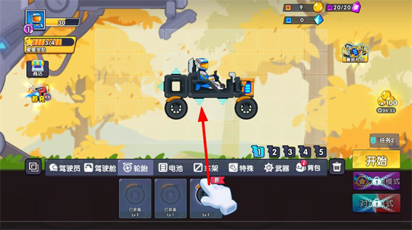 1、可組裝賽車,選擇駕駛員輪胎電池等部件,搭配完成后點擊開始按鈕,進入賽道開啟任務2的賽車挑戰。