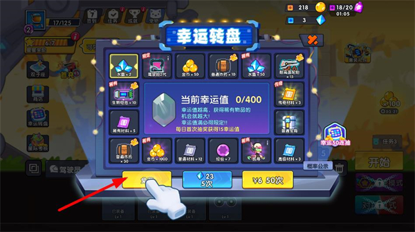 4、進入幸運轉盤界面,點擊按鈕參與抽獎,可獲得鉆石金幣等道具,積累幸運值還能解鎖稀有物品,助力賽車組裝與挑戰。