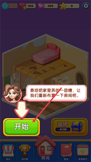 1、家里被弄亂需重新布置房間,點擊開始按鈕開啟房間布置和清理裝修的下一步進程。