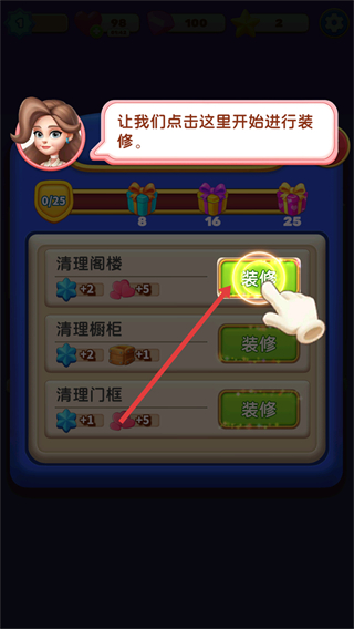 4、可點擊裝修按鈕開始進行裝修,通過完成裝修任務,解鎖新的家居區域或風格,繼續家居布置的解謎冒險。