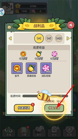 3、有戰利品界面,領取巡邏收益如金幣、英雄經驗、戰隊經驗,點擊領取全部可獲取對應獎勵。