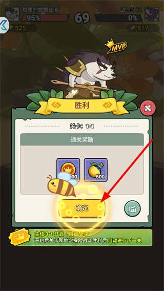2、戰斗勝利后還有通關獎勵如金幣、英雄經驗,點擊確定可領取獎勵并繼續游戲。