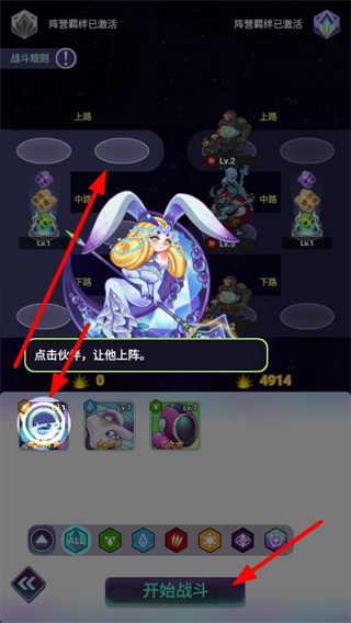 3、戰斗前布置伙伴陣型,點擊伙伴讓其上陣,組成陣容后點擊開始戰斗,通過策略布陣擊敗敵人。