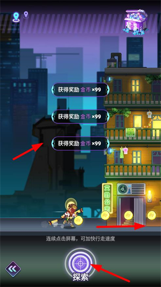 1、點擊探索按鈕,在都市里探索區域,連續點擊屏幕可加快行走速度,獲取金幣等獎勵,推進探案進程。
