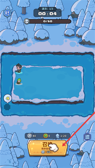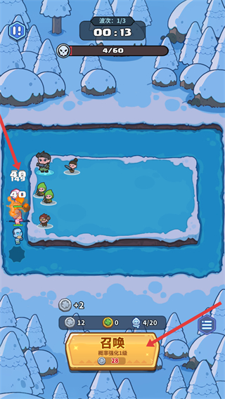 1、點擊召喚按鈕,消耗銀幣召喚英雄,在雪地場景中組建隊伍,開始抵御感染者的進攻。