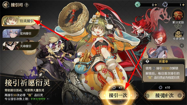 1、選擇衍靈接引,點擊接引一次或十次,參與祈愿,有機會獲得稀有衍靈,擴充衍靈陣容,提升戰力。