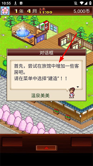 1、需在旅館里增加客房,按照指引在菜單里選擇建造選項,開啟旅館設施的搭建流程。