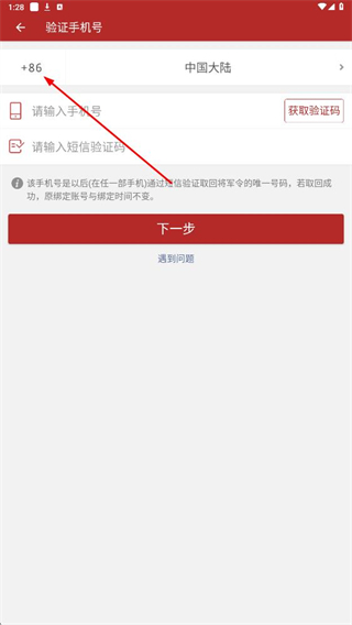 1、進入驗證手機號頁面,選擇中國大陸地區,輸入手機號并獲取驗證碼,點擊下一步,完成手機號驗證操作。