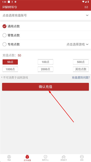 3、進入點卡充值頁面,選擇充值賬號和點數類型,如通用點數,選擇充值點數后點擊確認充值,進行點數充值操作。