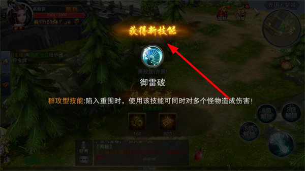2、獲得新技能御雷破,該技能為群攻型,陷入重圍時使用可同時對多個怪物造成傷害,增強戰斗能力。