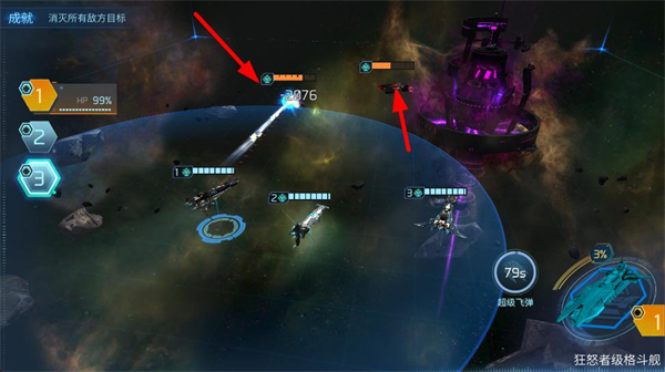 2、艦隊持續攻擊敵方目標,積累擊毀數,完成消滅所有敵方目標的成就,獲取戰斗獎勵,提升艦隊戰力。