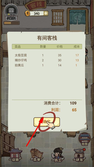 3、客人用餐后會生成消費賬單,顯示菜品數量價格及利潤,點擊確定完成結算,獲取對應的經營收益。