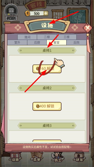 1、打開設施界面,在客堂分類下消耗對應數量的貨幣解鎖桌椅,拓展客棧的接待設施,方便后續接待客人。