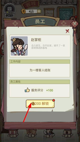 4、打開員工界面,消耗貨幣解鎖如趙掌柜等員工,員工可負責為客人結賬等工作,還能提升服務評分助力經營。