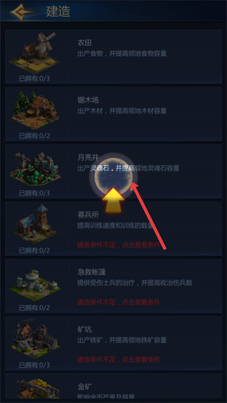 1、可建造不同建筑如月亮井,產出資源并提升容量,滿足建造條件后點擊建造,發展領地資源。