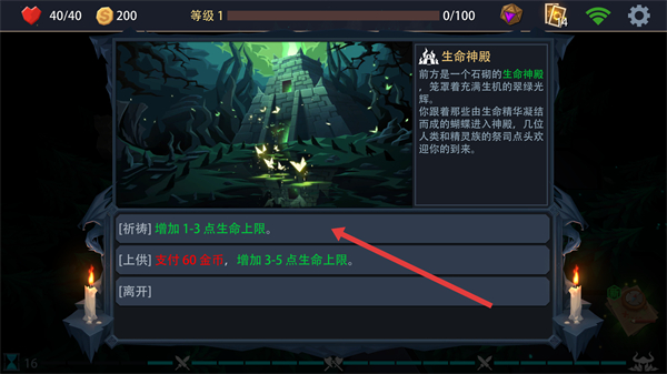 1、可選擇祈禱增加生命上限或上供金幣增加更多生命上限,提升生存能力,繼續地牢探險。