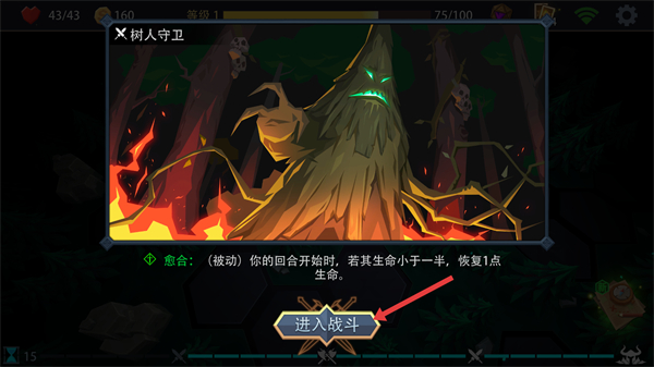 3、遇到樹人守衛等怪物時,點擊進入戰斗,了解怪物技能,如愈合被動,準備應對戰斗,爭取勝利。