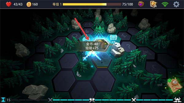 2、探索地牢時會消耗金幣獲得經驗,提升等級,在六邊形地圖中探索不同區域,尋找寶箱和資源。