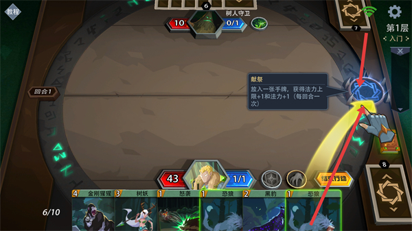 4、可進行獻祭,放入一張手牌獲得法力上限和法力,利用卡牌技能攻擊怪物,推進戰斗進程。