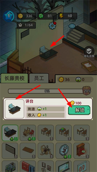 4、回到場館界面,選擇講臺,消耗100金幣點擊解鎖按鈕,開啟該設施,增加場館的刺激值與收入。