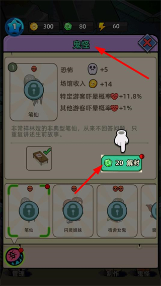 3、進入鬼怪界面,選擇筆仙,消耗20個對應道具點擊解封按鈕,解鎖該鬼怪,提升場館的收入與驚嚇概率。