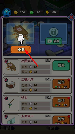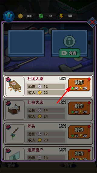 1、進入制作界面,選擇社團大桌,消耗對應資源點擊制作按鈕,生產該物品,提升場館的恐怖值與收入。