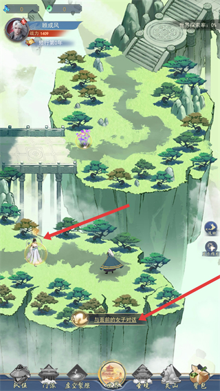 1、在世界場景可探索地圖,與面前的女子對話,推進游戲劇情,提升世界探索率,開啟修仙探索之旅。