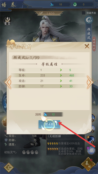 4、可提升角色等級,如顧成風,消耗資源升級后生命、攻擊、防御等屬性會提升,增強角色實力,助力修仙進程。