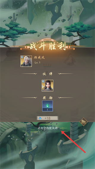 3、戰斗勝利后會顯示戰斗勝利界面,可查看角色、伙伴信息以及獲得的獎勵,點擊空白處關閉界面繼續游戲。