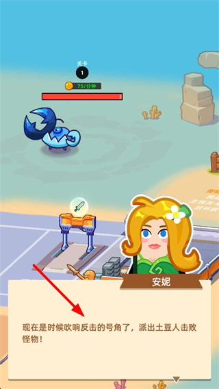 1、進入關卡1會看到怪物出現,安妮提示該吹響反擊號角,派出土豆人去擊敗怪物。