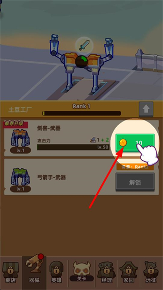 3、在土豆工廠界面可看到劍客武器裝備,點擊綠色按鈕花費10金幣升級該裝備,提升攻擊力助力戰斗。