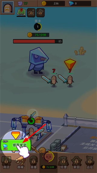 4、戰斗的過程界面會顯示怪物和土豆人,完成任務后點擊領取獎勵按鈕,可獲得對應的鉆石獎勵,積累資源。