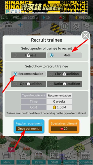 2、在招募界面,選擇招募性別與招募方式,點擊常規招募按鈕,消耗資源獲取練習生。