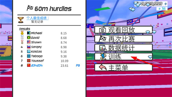 4、跨欄賽事結束后會顯示個人最佳成績和排名結果,可選擇觀看回放再次比賽數據統計訓練或返回主菜單,繼續體驗不同內容。