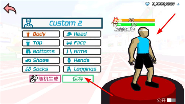 1、在裝扮界面可調整角色的BodyHeadTop等部位裝扮,也能點擊隨機生成更換形象,設置好后點擊保存就能確定當前的角色裝扮。
