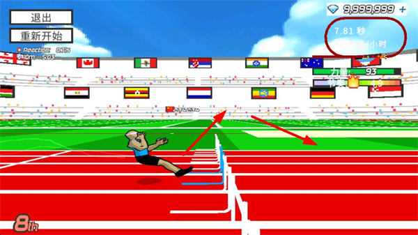 3、參與跨欄賽事時,角色需跨越跑道上的欄架,界面會顯示當前用時和力量等屬性,同時能看到自身的排名,按操作節奏完成賽程。