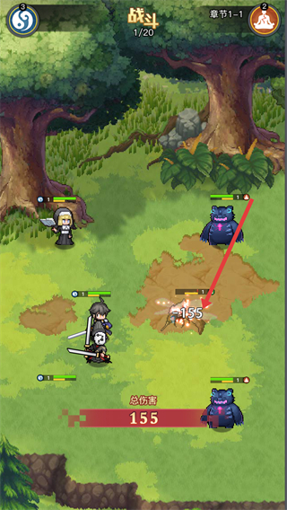 1、英雄們會攻擊怪獸,界面顯示傷害數值和總傷害,需操控英雄擊敗怪獸,推進章節進程。