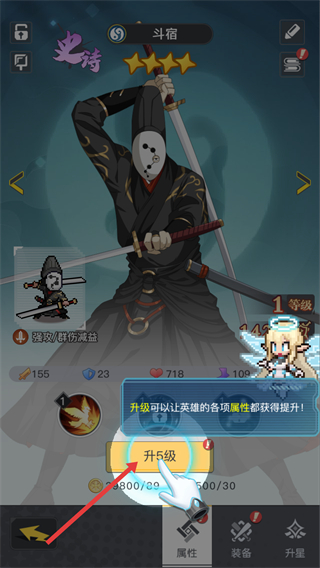 3、可升級英雄,如斗宿,點擊升5級按鈕,消耗資源提升等級,讓英雄各項屬性獲得提升。