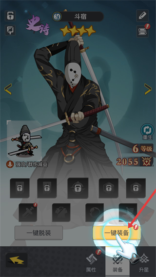 4、在英雄裝備界面,可點擊一鍵裝備按鈕,為英雄配備裝備,提升英雄戰力,助力戰斗。