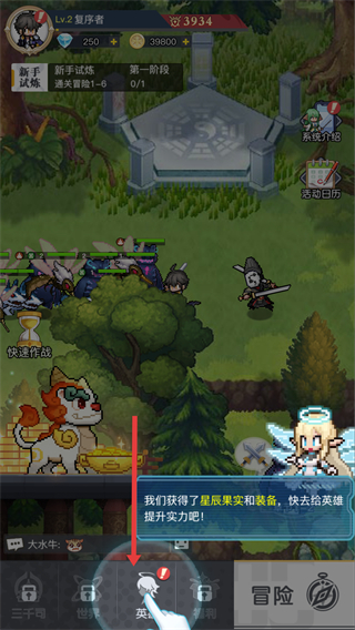 2、獲得星屑果實和裝備后,可進入英雄界面提升實力,點擊英雄按鈕,開展英雄養成操作。