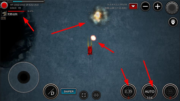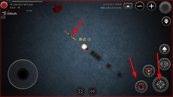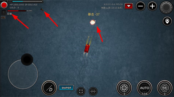 1、操控紅色戰機,利用攻擊按鈕攻擊巨蟻等怪物,觸發暴擊可造成更高傷害,同時關注HP和SP數值,推進山地地圖的戰斗。