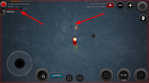 2、擊敗怪物后獲得GOLD獎勵,遇到荒野戰狗等新怪物,繼續操控戰機攻擊,界面會顯示怪物的血量進度,持續推進當前地圖的戰斗。