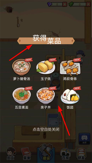 1、獲得多款菜品,包括蘿卜豬骨湯、玉子燒等,點擊空白處關閉菜品界面,開啟壽司店的菜品經營流程。