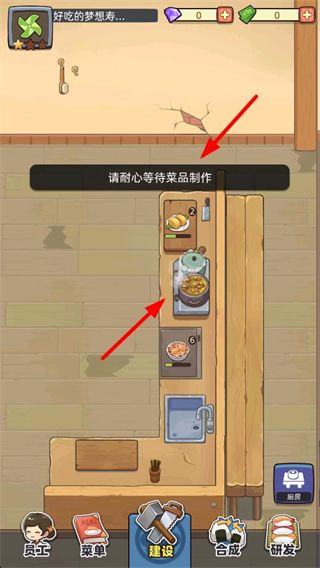 3、進入廚房界面,等待菜品制作完成,觀察制作進度提示,準備后續的菜品出品操作,推進經營流程。