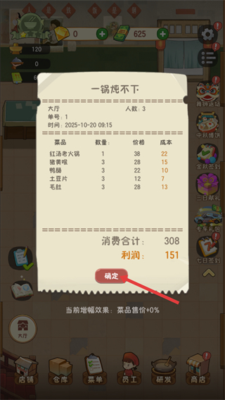 4、顧客用餐結束后,會出現包含消費合計、利潤等信息的賬單,點擊確定,完成該次用餐結算流程。