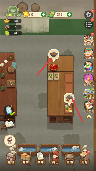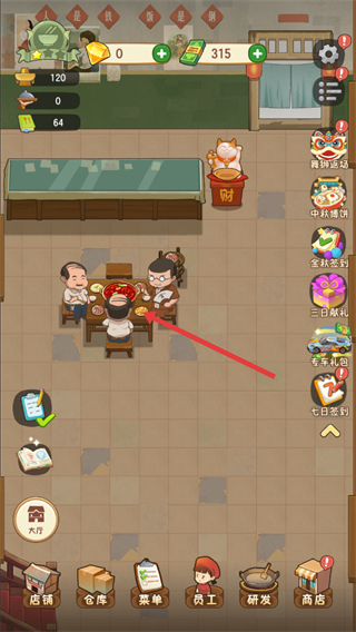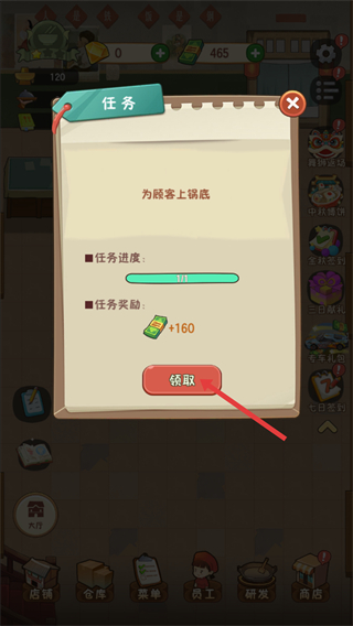 3、完成為顧客上鍋底任務后,可點擊領取,獲得160金錢獎勵,積累資金用于店鋪后續發展。