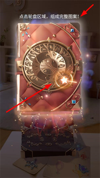1、點擊輪盤區域,調整輪盤碎片組成完整圖案,完成該解謎步驟后,推進魔法書相關的劇情流程。