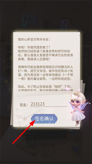 3、查看信件內容后,點擊簽名確認按鈕,完成信件相關的交互流程,繼續推進魔法書的劇情冒險。