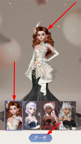 4、進入角色裝扮界面,選擇喜歡的角色形象,選定后點擊下一步按鈕,繼續推進游戲的后續內容。